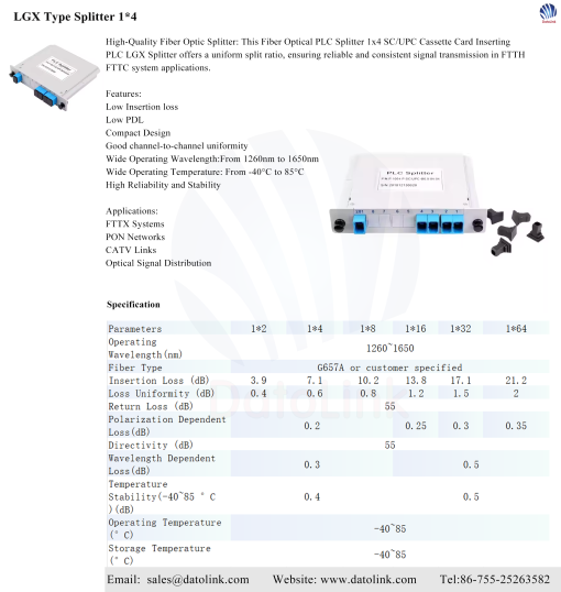 The PLC Splitters is branching devices that is used to distribute optical signals to multiple locations for processing. In optical networks, it is often necessary to split an optical signal into many identical signals, or to combine many signals into a single signal. PLC Splitter (Planar lightwave circuit splitter) is a type of optical power management device that is fabricated using silica optical waveguide technology. They are designed for FTTx Passive Optical Networks, CWDM, DWDM and optical cable TV System. PLC Splitter is responsible to distribute optical signals from Central Office (CO) to multiple premise locations.We provides whole series of 1*N and 2*N splitter products that are tailored for specific applications.