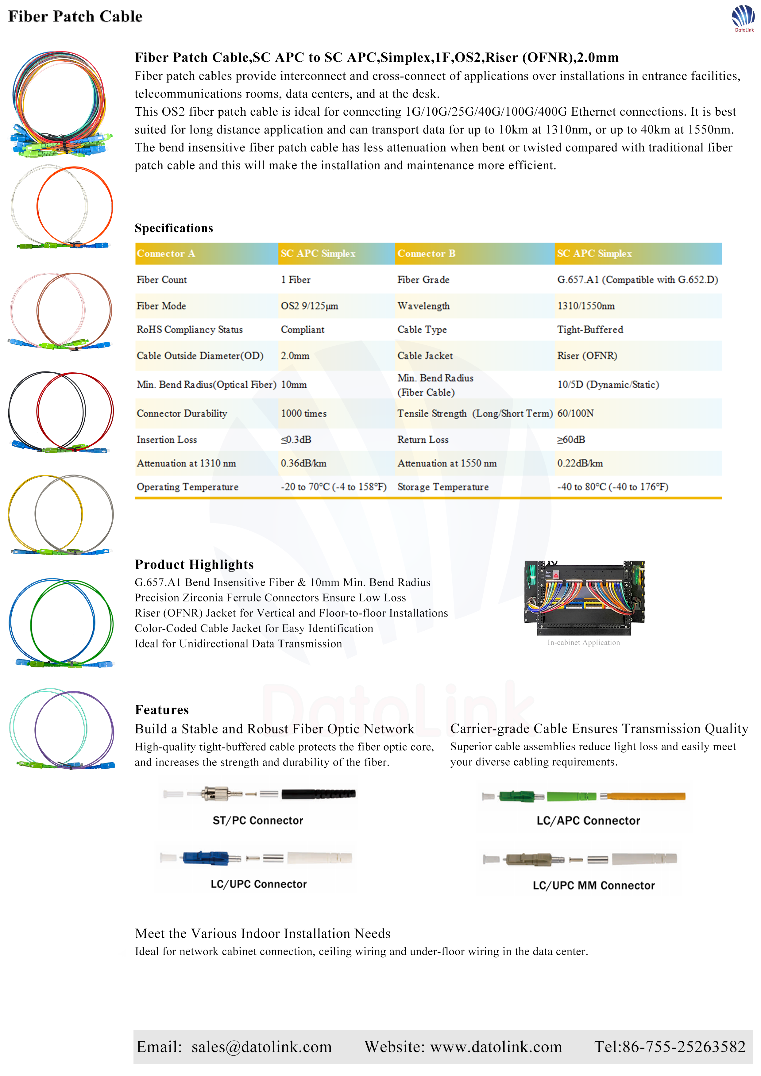 | Cable Outside Diameter(OD) | 2.0mm | Cable Jacket | Riser (OFNR) |
