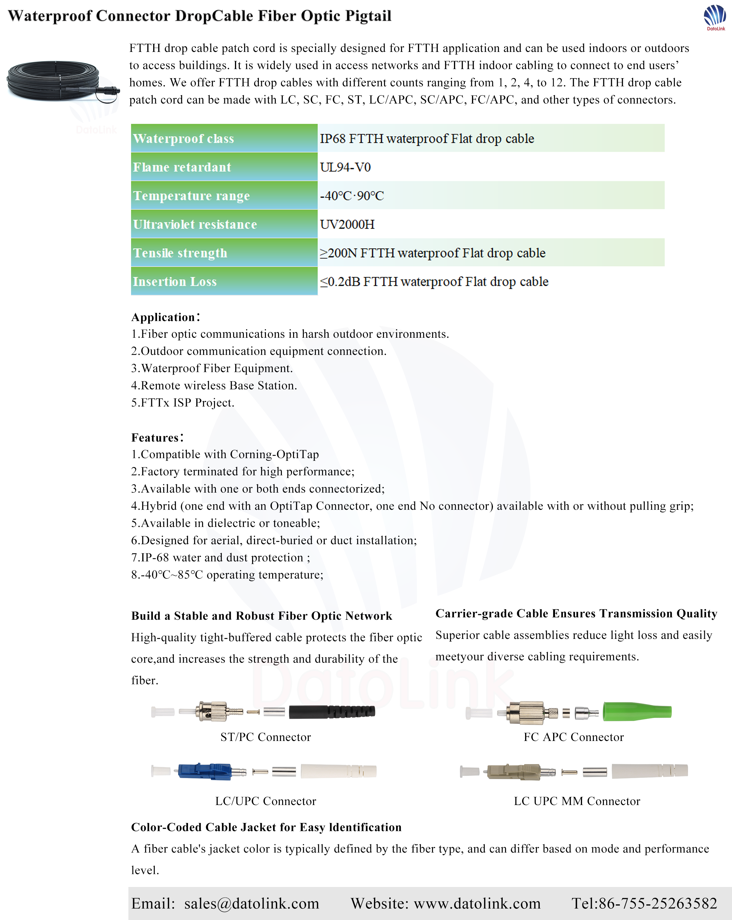 | Waterproof class | IP68 FTTH waterproof Flat drop cable |